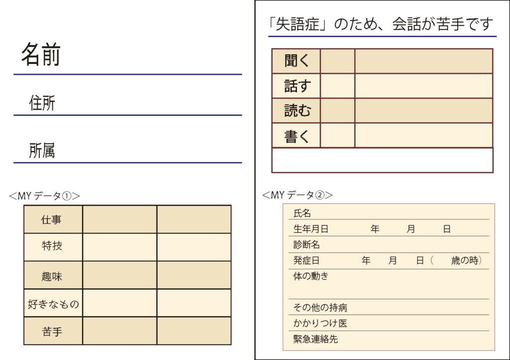 「失語症があります」「こういう配慮をお願いします」と書いたカードを用意しておくと安心です。名刺サイズに折って使うとプライバシーも守れます。緊急連絡先を入れておくのもおすすめです。